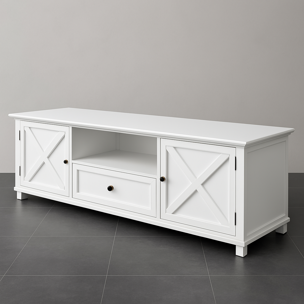 - The new trend of HAMPTON style TV stands is increasing day by day, which can be used for multi-functions. It is manufactured with MDF and NZ pine wood mixed and made in a rectangular shape, a perfect one for your TV lounge.